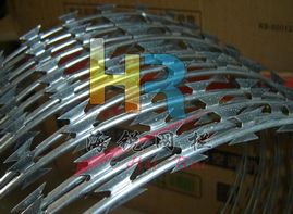 規格多,品種全.(2012)8001-8002/鐵路工程建設通用規格.刺絲滾籠刺長22mm, 圈徑為500mm,芯線2.5mm,刀刺中心間距34mm,刀片厚度0.5mm,刺絲滾籠圈距200mm,立柱支架30x50x2mm,縱向刺絲拉筋2.5x2.2x20mm,支架抱箍為8mm,配件都采用熱鍍鋅處理.
